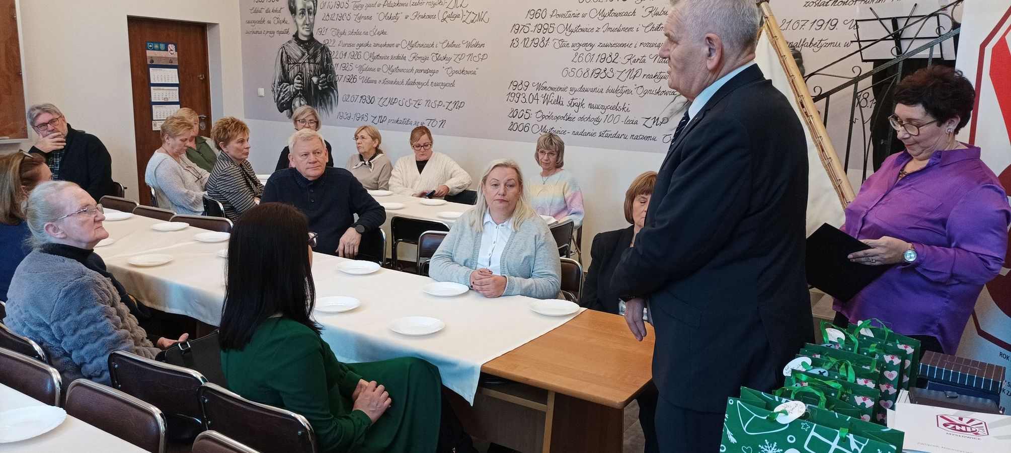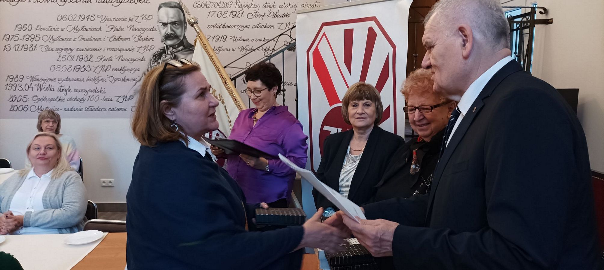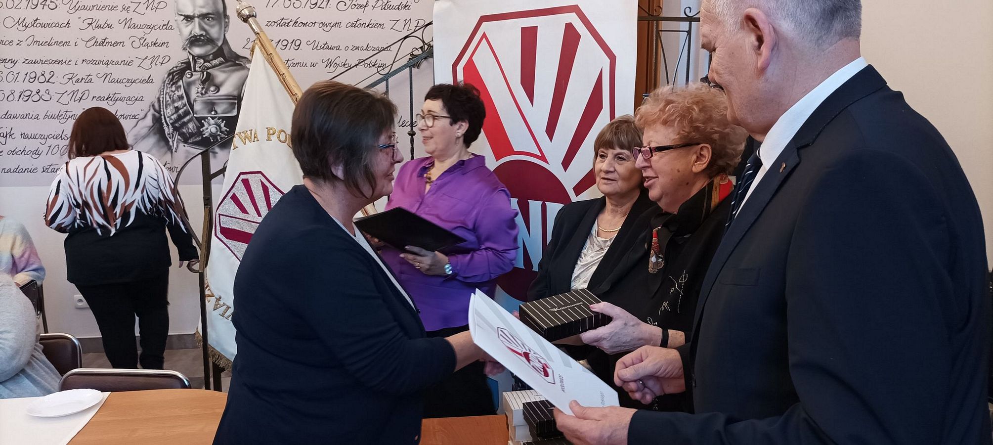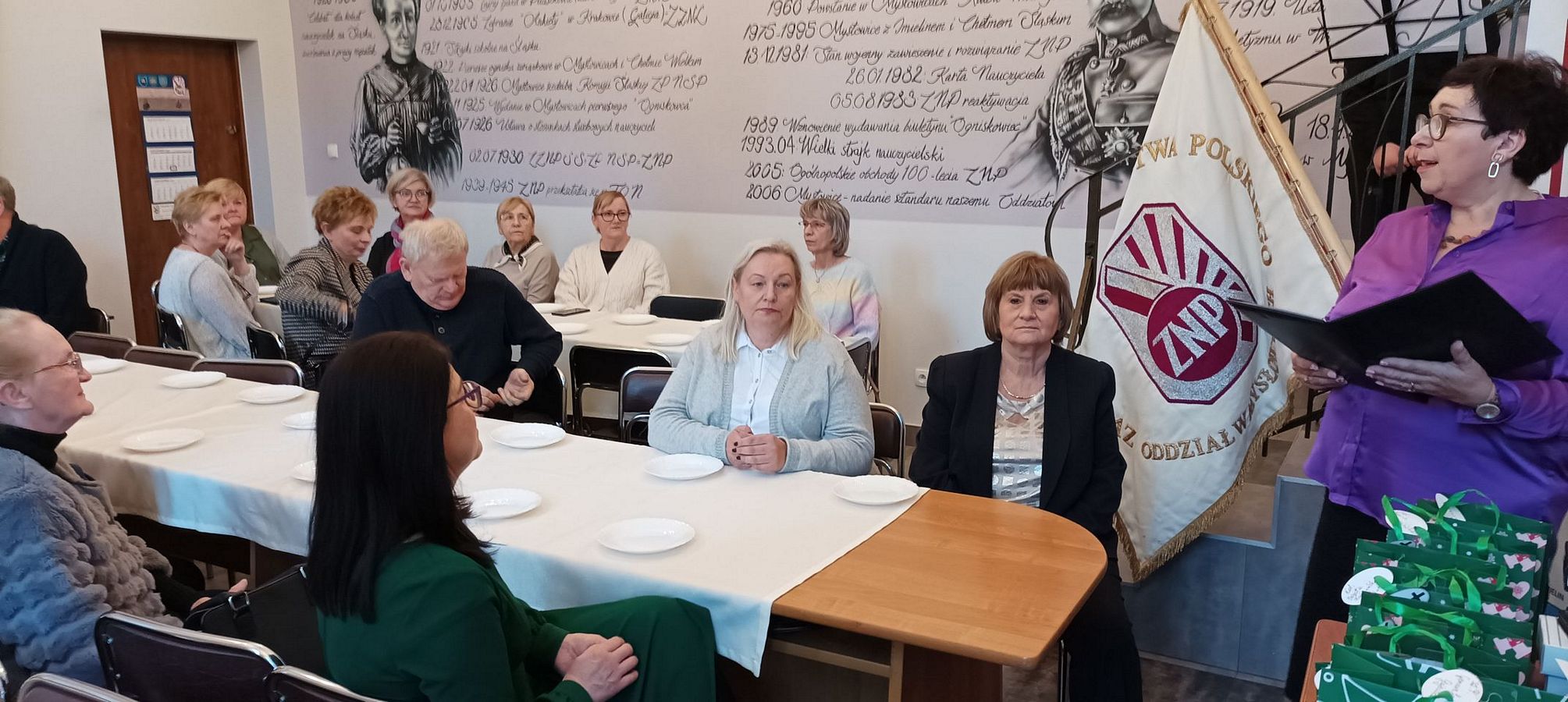 30 listopada b.r. odbyła się w naszej siedzibie uroczystość Oddziałowego Dnia Związkowca. Część oficjalną rozpoczęliśmy od odśpiewania hymnu związkowego do tekstu Stefana Zaleskiego na nutę „Warszawianki”. Następnie wiceprezes Zarządu Oddziału – Irena Wybraniec powitała koleżanki i kolegów związkowców. Przypomniała, że Dzień Związkowca jest świętem związkowej wspólnoty, okazją do spotkań członków Związku Nauczycielstwa Polskiego naszego oddziału. W tym dniu członkowie ZNP otrzymują odznaczenia oraz podziękowania za swoją pracę na rzecz Związku i edukacji. Zapowiedziała także, że podczas tej uroczystości powitane również zostaną w gronie Sekcji Emerytów i Rencistów osoby, które przeszły w tym roku na świadczenie kompensacyjne, emeryturę lub rentę.