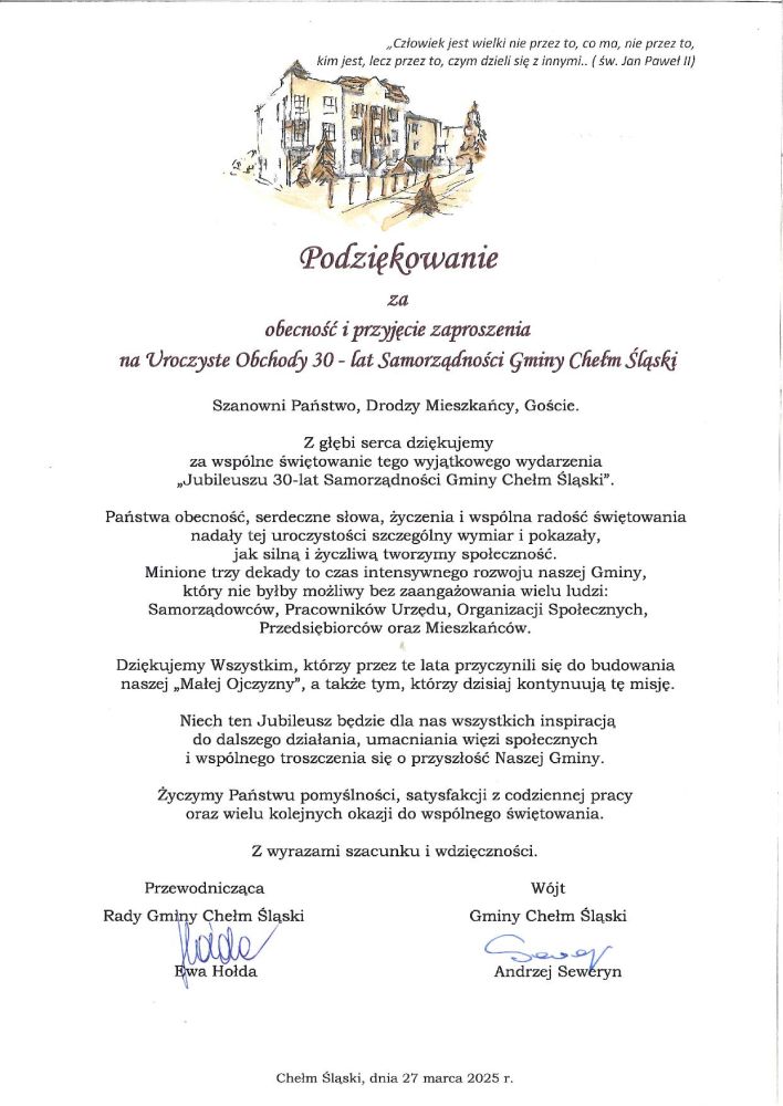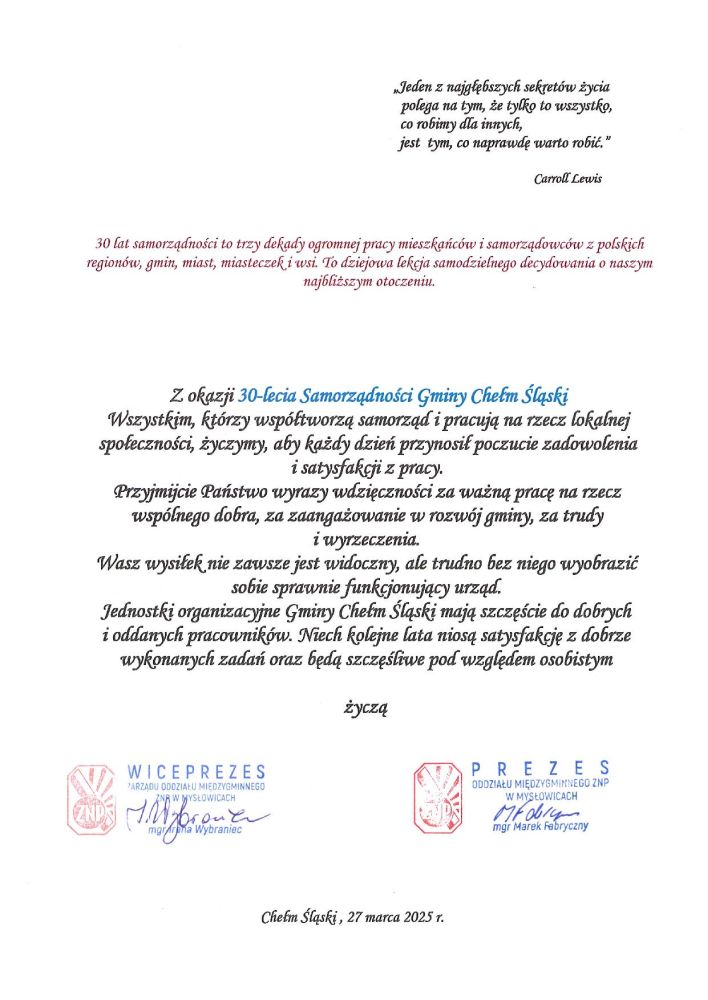 Było to wydarzenie pełne refleksji, wspomnień oraz dumy z dorobku gminy na przestrzeni trzech dekad. Podczas uroczystości przypomniano najważniejsze osiągnięcia samorządu, podziękowano wszystkim, którzy swoją pracą i zaangażowaniem przyczynili się do rozwoju Chełmu Śląskiego, a także uhonorowano osoby zasłużone dla lokalnej społeczności.