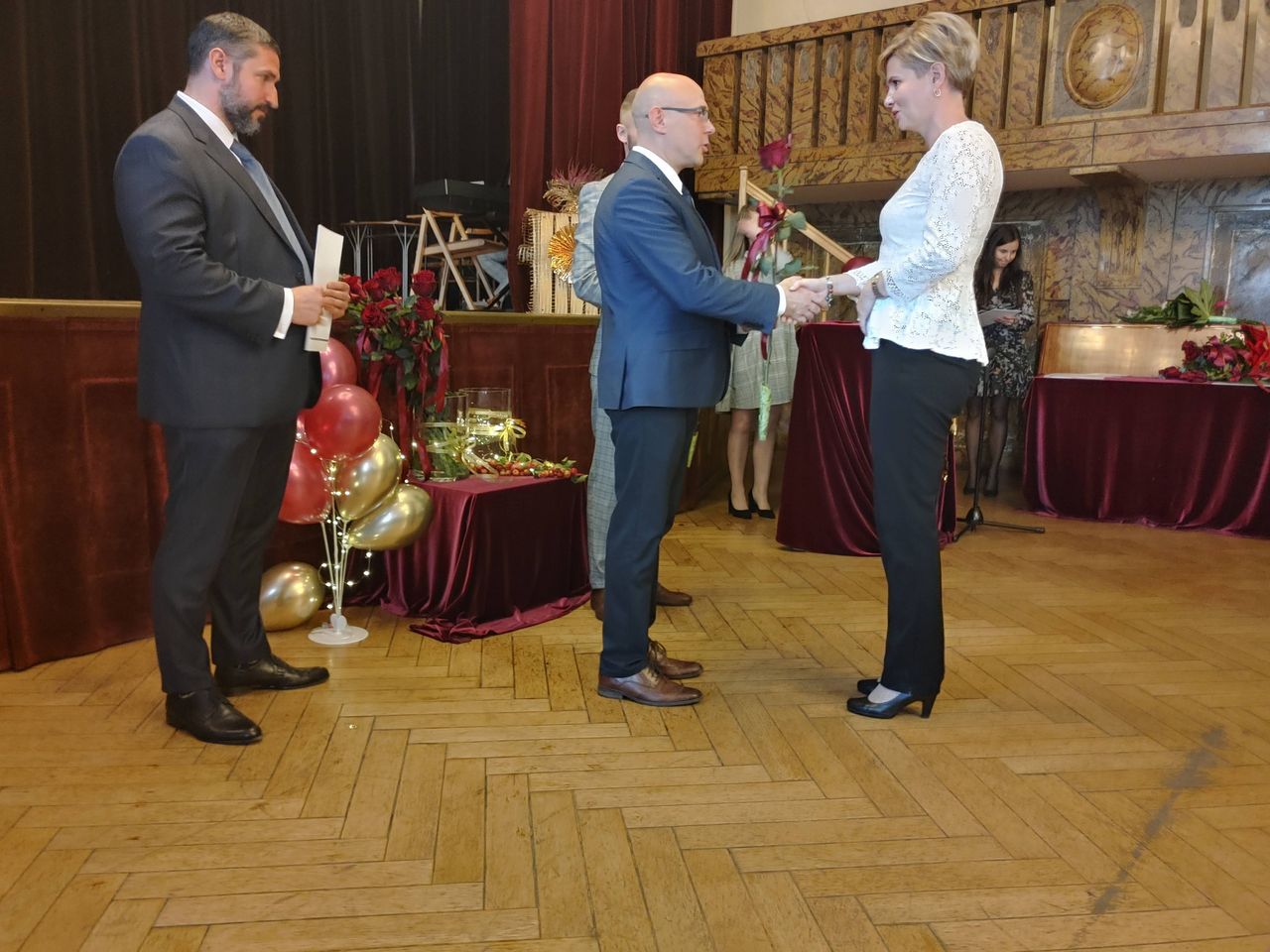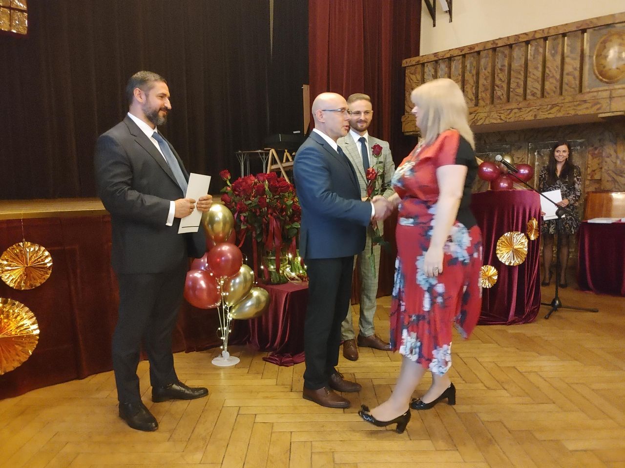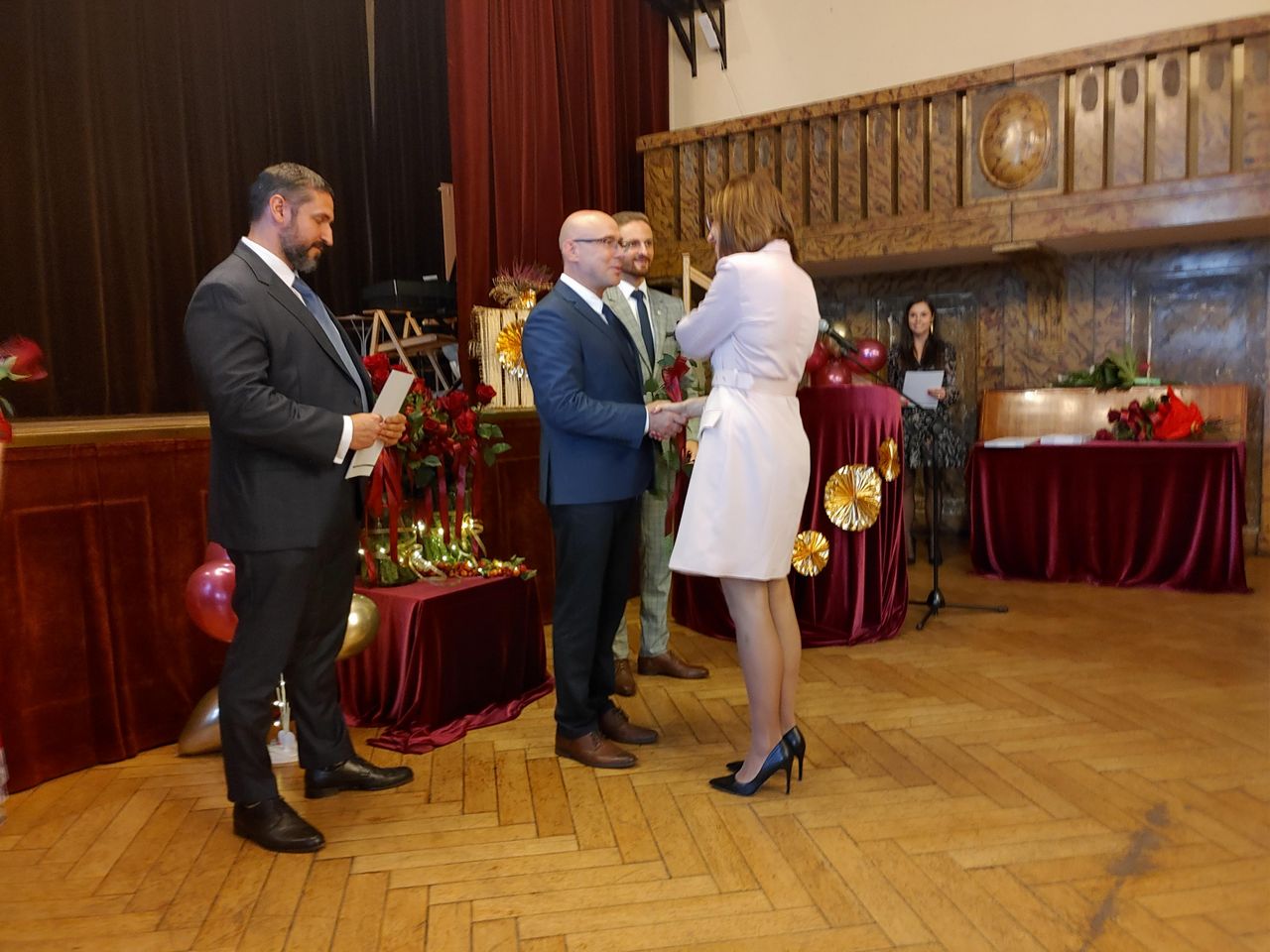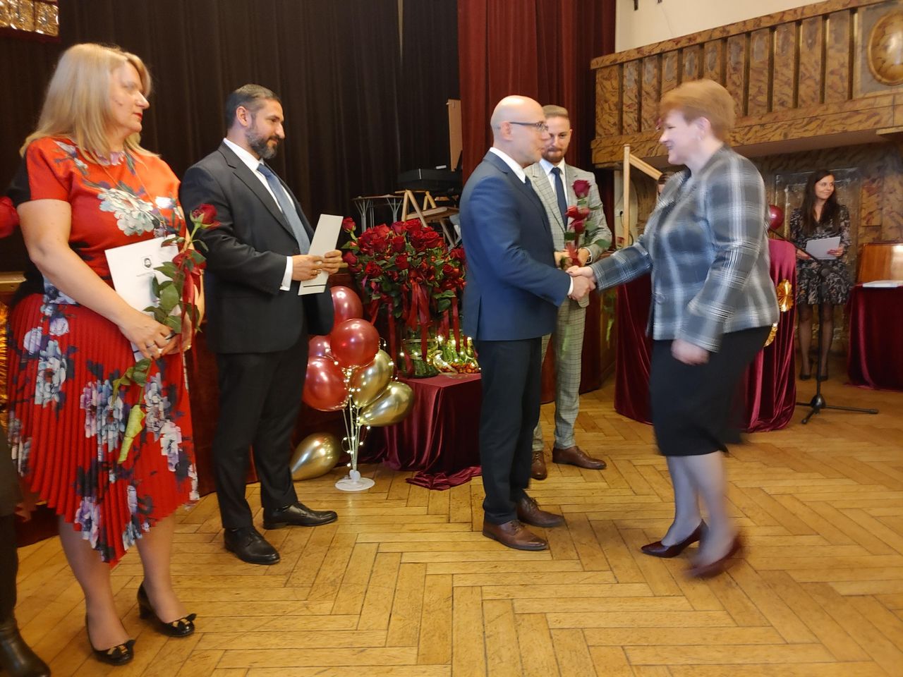 Życzenia nagrodzonym złożył Prezydent Miasta Mysłowice Pan Dariusz Wójtowicz, Naczelnik Wydziału Edukacji Pani Małgorzata Słonina, w imieniu Rady Miasta Przewodnicząca Komisji Edukacji Pani Joanna Pniok, Przewodnicząca MOZ Solidarność Grażyna Chomiuk.