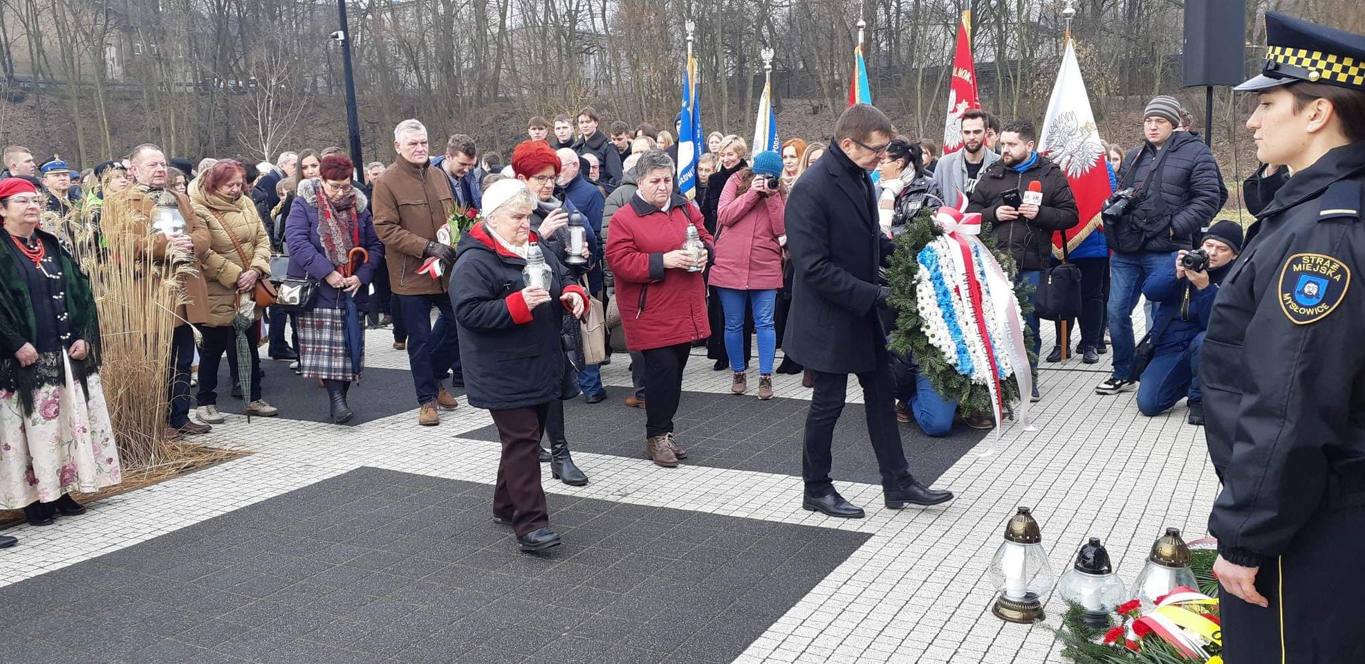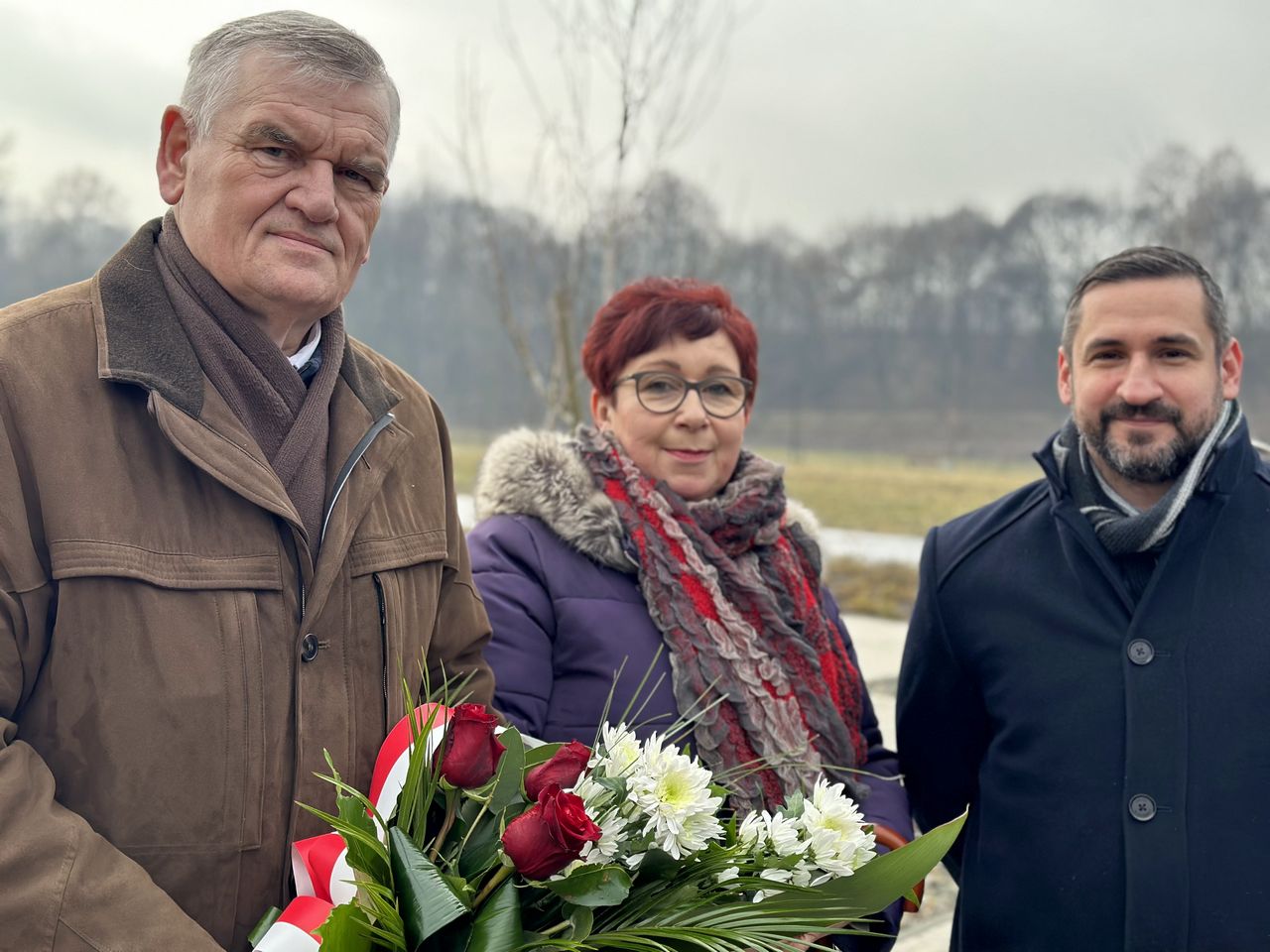 Przedstawiciele Związku Nauczycielstwa Polskiego w Mysłowicach: kol. Irena Wybraniec Wiceprezes Zarządu Oddziału Międzygminnego ZNP oraz Prezes Oddziału Międzygminnego ZNP Marek Fabryczny, złożyli symboliczną wiązankę biało-czerwonych kwiatów.