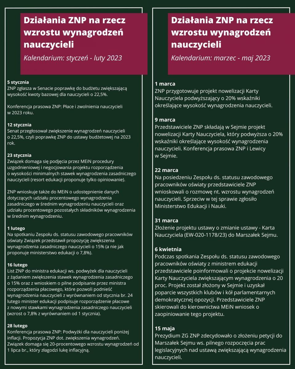 (28.02.2023) ZNP walczy o 20 proc. wzrost płac. Choć prezydent podpisał ustawę budżetową na początku lutego, to minister edukacji Przemysław Czarnek zwlekał trzy tygodnie z podpisaniem tzw. rozporządzenia płacowego. W efekcie, nauczyciele otrzymają podwyżkę 7,8 proc. z dużym opóźnieniem. ZNP nie poddaje się i walczy o wzrost płac nauczycieli od 1 lipca br. na poziomie minimum 20 proc. [CZYTAJ DALEJ]