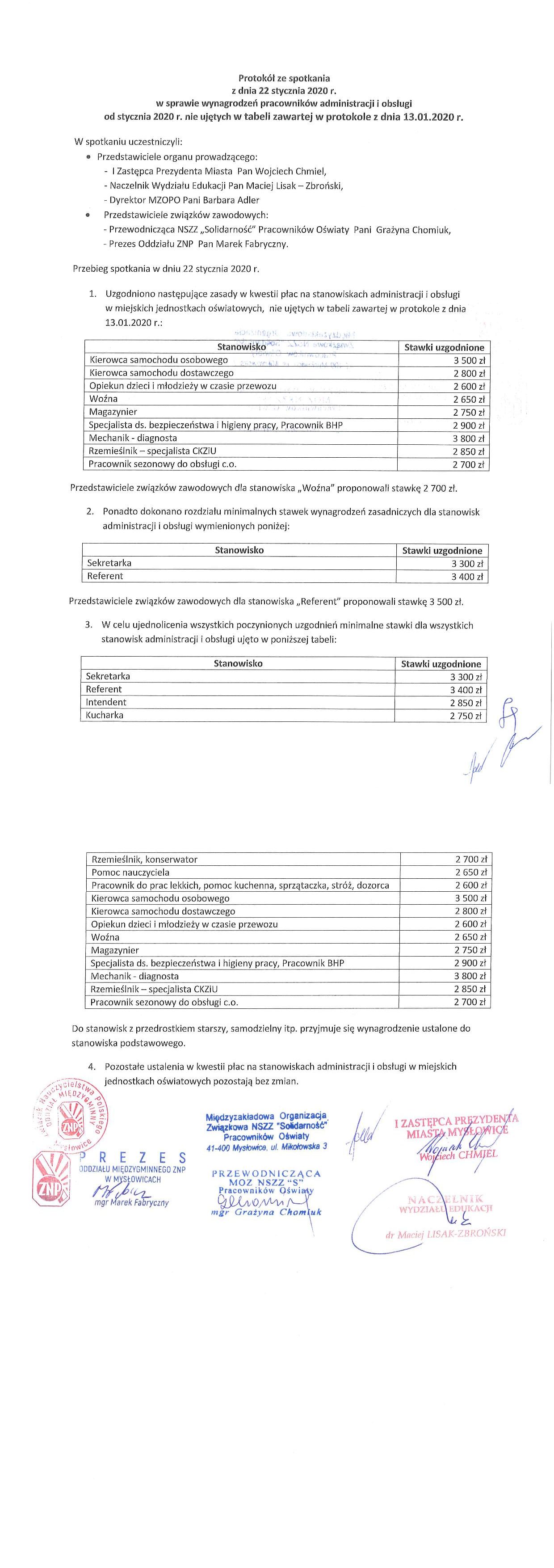 (22.01.2020) Protokół ze spotkania dnia 22 stycznia 2020 r.*w sprawie wynagrodzeń administracji i obsługi nie ujętych w protokole z 13.01.2020r.