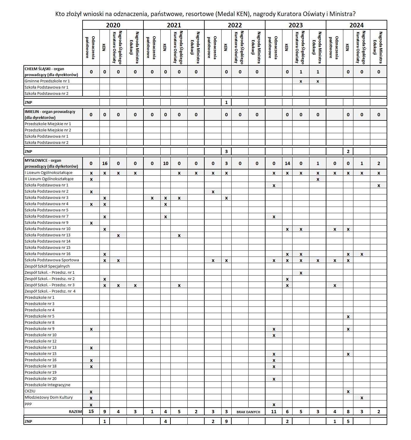 (23.04.2025) Kto złożył wnioski na odznaczenia państwowe, resortowe (Medal KEN), nagrody Ministra i Kuratora Oświaty?. Ciekawe, że niektóre samorządy oraz niektórzy dyrektorzy przez te lata nie złożyli żadnych wniosków. Złożenie Wniosku nie oznacza, że zostanie pozytywnie rozpatrzony, z kolei niezłożenie wniosków przez te lata też o czymś świadczy. Niektóre placówki składały więcej niż jeden wniosek. Interesującej lektury.
