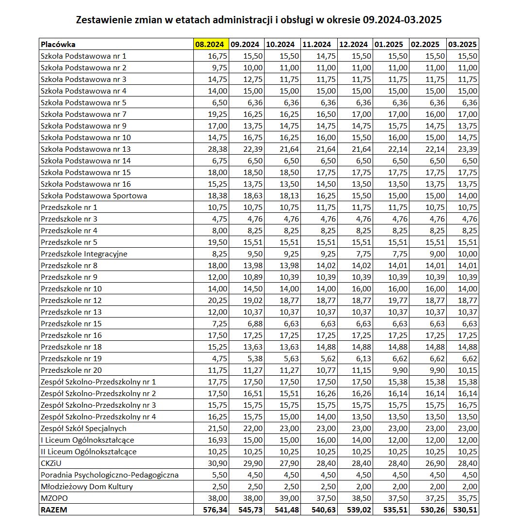 (29.04.2025) Porównajcie zmiany w etatach administracji i obsługi w okresie od września 2024 do marca 2025. Przypominamy, że Zarządzenie Prezydenta Miasta Mysłowice nr 359/24 w sprawie wytycznych zatrudnienia pracowników administracji i obsługi weszło w życie 21 sierpnia 2024 roku.